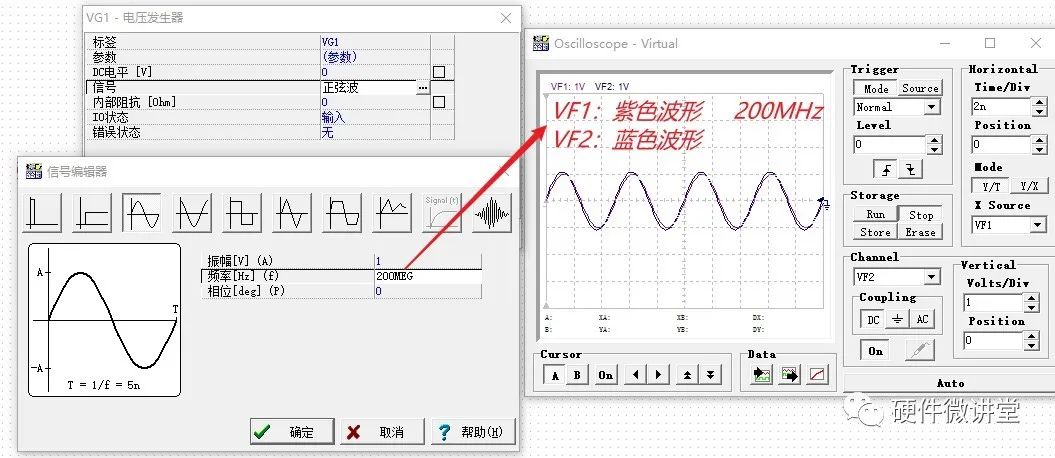 如果我們把VF1的頻率調(diào)整為200MHz,再看一下仿真效果,如下圖所示,VF2比VF1稍微大一點,此時依然是有放大倍數(shù),比1大一點,記為B。