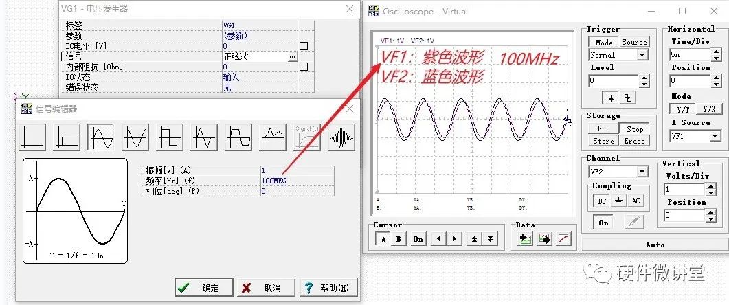 如上圖所示,VF1是輸入端信號波形,100MHz,VF2是輸出端信號波形,也是100MHz。從幅值上看,VF2比VF1稍微大一點點。其實,此時是有放大倍數(shù)的,只是倍數(shù)比1大一點點,假定該放大倍數(shù)為A。