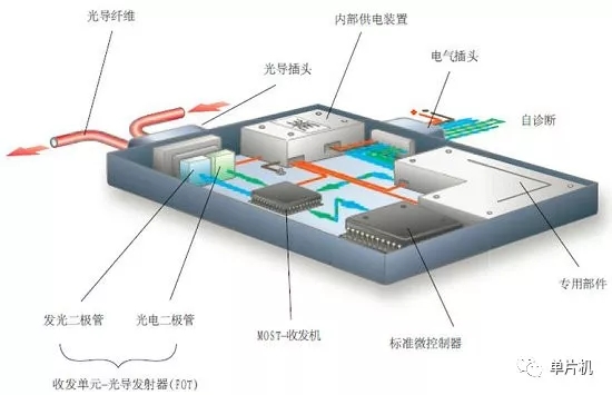 MOST收發(fā)器:MOST收發(fā)器由發(fā)射機和接收機兩個部件組成。