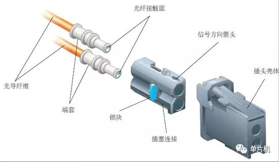 光導纖維插頭:光纖使用專門的光學插頭與控制單元連接。插頭上的一個信號方向箭頭表明(至接收機的)輸入端,插頭外殼形成與控制單元的連接。光信號通過由光導纖維導線和光導插頭進入控制單元或傳往下一個總線用戶。