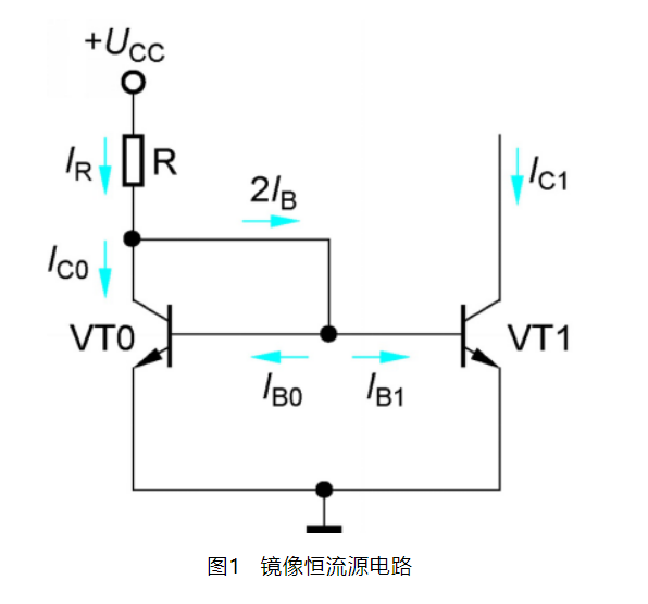 如圖1所示為鏡像恒流源電路,它由兩只特性完全相同的管子VT0和VT1構成,由于VT0管的c、b極連接,因此UCE0=UBE0,即VT0處于放大狀態(tài),集電極電流IC0=β0*IB0。另外,管子VT0和VT1的b-e分別連接,所以它們的基極電流IB0=IB1=IB。設電流放大系數(shù)β0=β1=β,則兩管集電極電流IC0=IC1=IC=β*IB??梢?,由于電路的這種特殊接法,使兩管集電極IC1和IC0呈鏡像關系,故稱此電路為鏡像恒流源(IR為基準電流,IC1為輸出電流)。