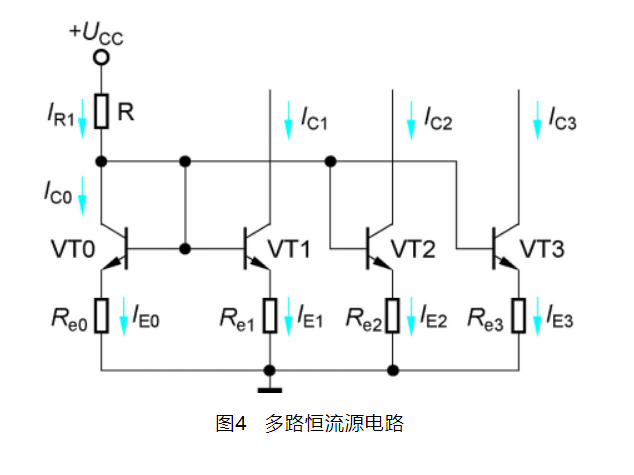 圖4所示電路是在比例恒流源基礎上得到的多路恒流源電路,IR為基準電流,IC1、IC2和IC3為三路輸出電流。由于各管的b-e間電壓UBE數(shù)值大致相等,因此可得近似關系