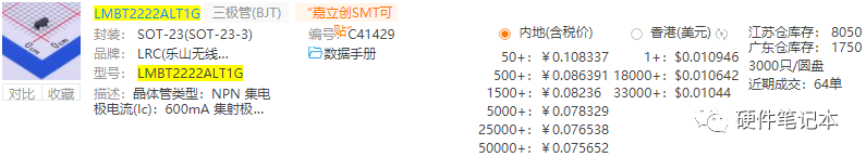 那他們的價格相差多少呢?我在立創(chuàng)上搜了一下,MOS管的三極管的價格幾乎是三極管的6倍。如下圖: