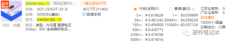 那可以用I/O口直接驅動MOS管嗎?答案是可以的,但這種型號不好找,這里給大家推薦一個NMOS型號:DMN6140L-13(因為用的少,目前就知道這個型號,如果大家有知道的,可以在評論區(qū)告訴我,感謝)。