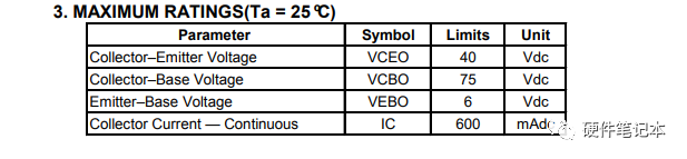 我們再來看看,常用的NPN三極管LMBT2222ALT1G的帶載能力,最大電流IC=600mA。