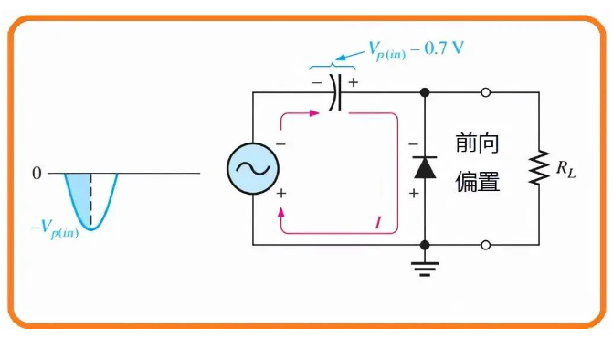 對(duì)于該電路的實(shí)際工作,假設(shè)波的負(fù)循環(huán)通過(guò)二極管。在信號(hào)二極管的負(fù)半部分處于正向偏置狀態(tài)期間,由于鉗位電路中的電容器充電至值 (Vp(in) – 0.7 V),如上圖所示。