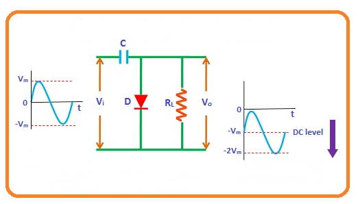 因此,負(fù)載電阻兩端的電壓將是電容器兩端的電壓 -V m和輸入源電壓-V m的相加,即 (-2V m )。由于原始信號(hào)移動(dòng)到 x 軸下方。