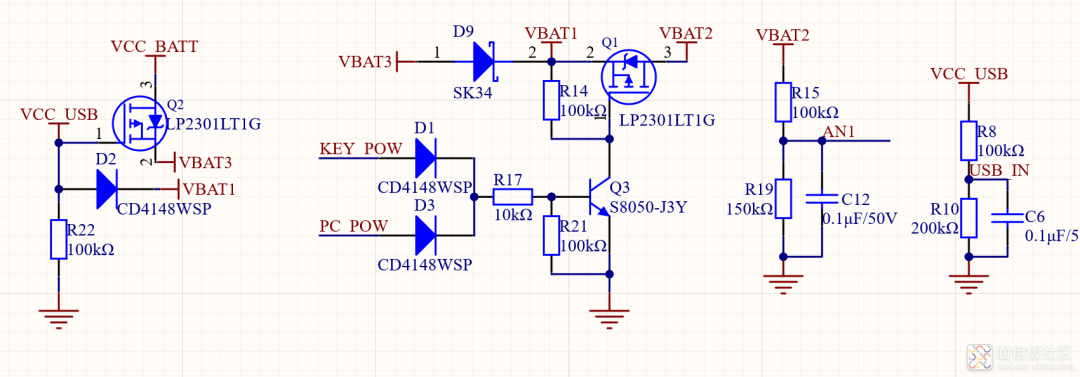 對(duì)于供電系統(tǒng)的總開(kāi)關(guān)是一個(gè)PMOS,其控制端上拉后通過(guò)一個(gè)三極管控制,當(dāng)三極管導(dǎo)通時(shí),PMOS控制端電平為低,此時(shí)PMOS導(dǎo)通,系統(tǒng)有電;