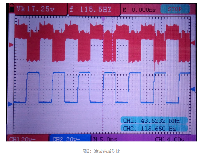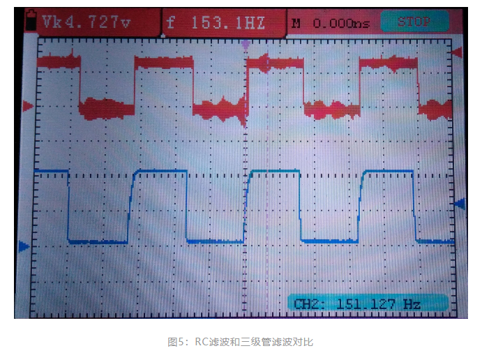 ?圖5是實測無刷電機霍爾信號經(jīng)過RC濾波后和三級管后濾波的波形對比,紅色波形代表霍爾信號經(jīng)過RC濾波后的,藍色波形代表霍爾信號經(jīng)過RC濾波再經(jīng)過三極管濾波后的;