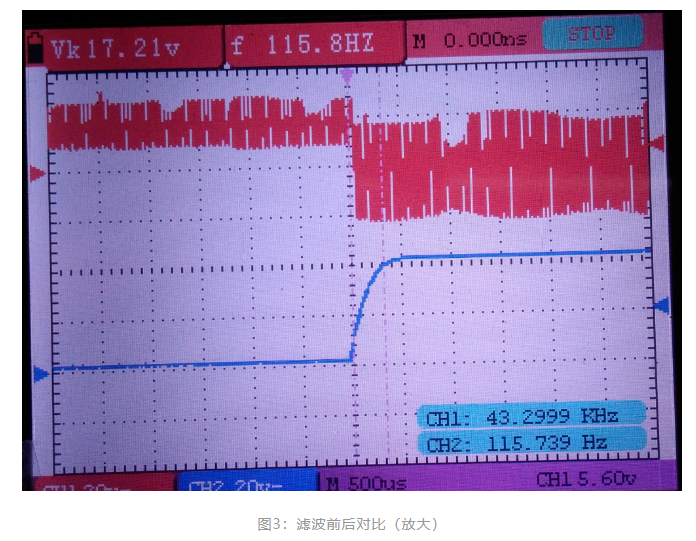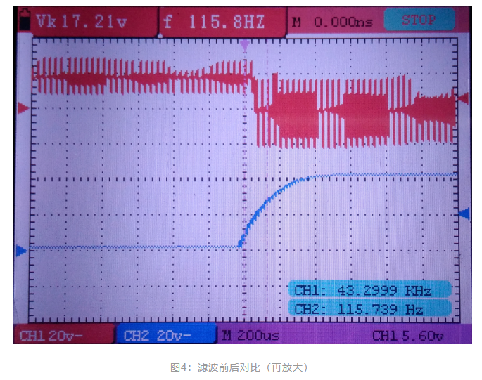 ?圖2、圖3、圖4是實測無刷電機霍爾信號濾波前后的波形對比,紅色波形代表霍爾信號濾波前的;藍色波形代表霍爾信號濾波后的。濾波前的毛刺異??植?。
