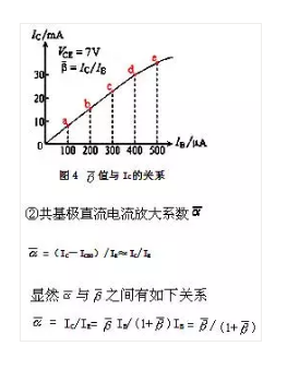 在放大區(qū)基本不變。在共發(fā)射極輸出特性曲線上,通過垂直于X軸的直線(vCE=const)來求取IC / IB ,如圖3所示。在IC較小時(shí)和IC較大時(shí),會有所減小,這一關(guān)系見圖4。