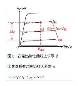 在放大區(qū),β值基本不變,可在共射接法輸出特性曲線上,通過垂直于X軸的直線求取△IC/△IB?;蛟趫D02.08上通過求某一點(diǎn)的斜率得到β。具體方法如圖6所示