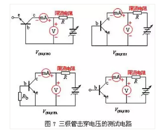 反向擊穿電壓表示三極管電極間承受反向電壓的能力,其測試時(shí)的原理電路如圖7所示。
