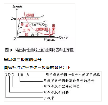 由最大集電極功率損耗PCM、ICM和擊穿電壓V(BR)CEO,在輸出特性曲線上還可以確定過損耗區(qū)、過電流區(qū)和擊穿區(qū),見圖8。