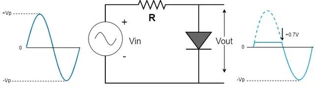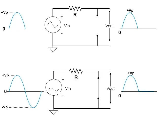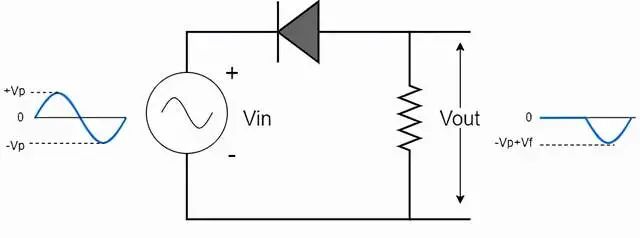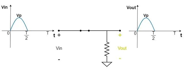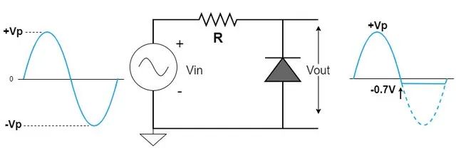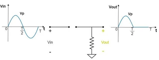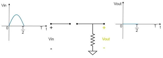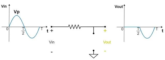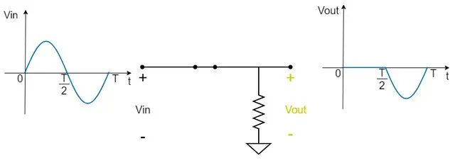 此電路中,在輸入信號的正間隔期間,二極管反向偏置,因此開路。在正半周,輸出與輸入信號直接平行。因此,輸入信號會出現(xiàn)在輸出上。而在輸入信號的負(fù)半周,二極管正向偏置并因此短路。在此期間,輸出電壓理想情況下等于0V。