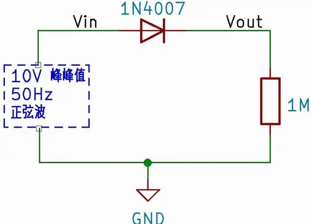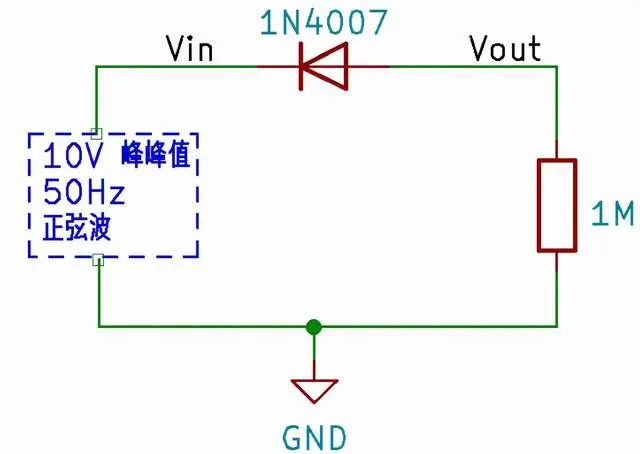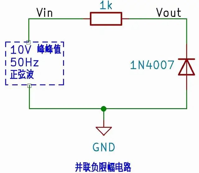 . 負(fù)半周期間,輸出電壓Vout=0V我們用下面的電路測試串聯(lián)負(fù)向限幅電路: