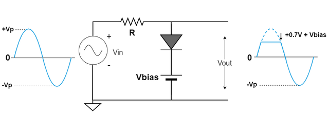 將偏置電壓Vbias與二極管串聯(lián)可以產(chǎn)生任意電平的二極管限幅電路。串聯(lián)組合兩端的電壓必須大于Vbias+0.7V二極管才能導(dǎo)通。例如,如果Vbias電平為4.0V,那么二極管正極的電壓必須大于4.0+0.7=4.7V才能讓二極管導(dǎo)通。任何高于此偏置電壓的電平會被剪掉。