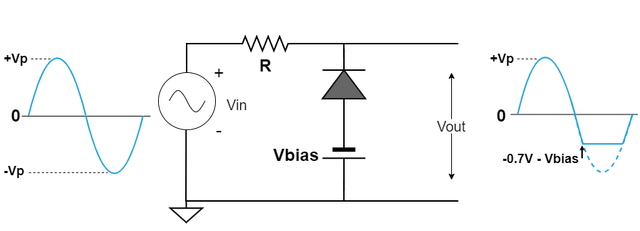 電路中,偏置電源的負(fù)極反向偏置二極管,只有當(dāng)輸入信號小于-Vbias-0.7V時(shí)二極管才會導(dǎo)通。