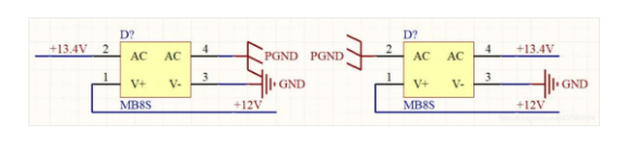 如上圖所示,增加一個(gè)整流橋,不管+13.4V和PGND怎么接,在1、3引腳上都能產(chǎn)生正確的+12V和GND。