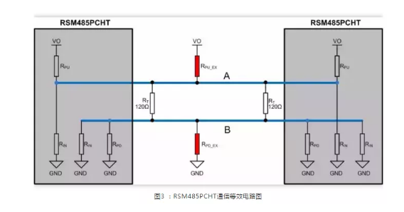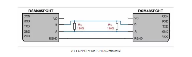 因此為了防止485總線出現(xiàn)上述情況,通常在485總線上增加上下拉電阻(通常A接上拉電阻,B總線下拉電阻)。若使用隔離RS-485收發(fā)模塊(例如RSM485PCHT),由于模塊內部具有上下拉電阻(對于RSM485PCHT,內部上下拉電阻為24kΩ),因此在模塊外部一般不需要增加上下拉電阻。