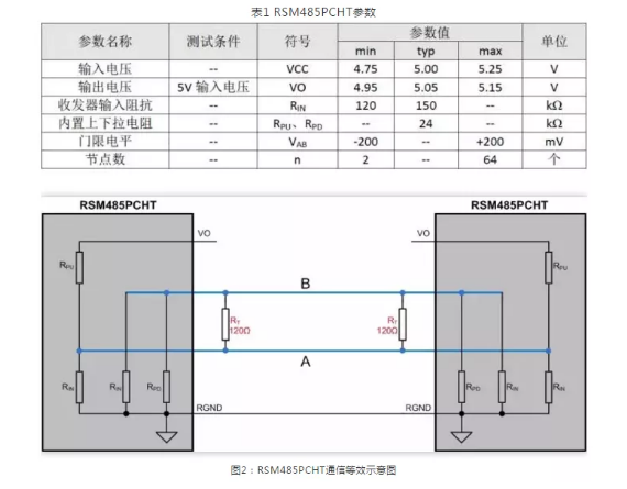 根據RSM485PCHT的具體參數(如表1)可以得到如圖2所示等效電路,其中RPU、RPD為模塊內部在485總線上加的上下拉電阻,RIN為模塊的輸入阻抗。