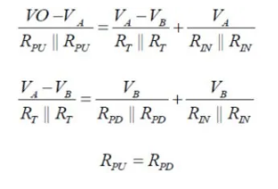 假設模塊的輸出電源電壓V?O相同,由于RGND接在一起,因此可以認為模塊內部的上拉電阻是并聯(lián)在一起的,為了方便解釋,對圖2的電路進行整理,如圖3所示,在模塊外部增加上下拉電阻可以選擇只增加一組,也可以選擇在每個模塊都增加上下拉電阻,為了解釋方便,我們在485總線上增加一組上下拉電阻。