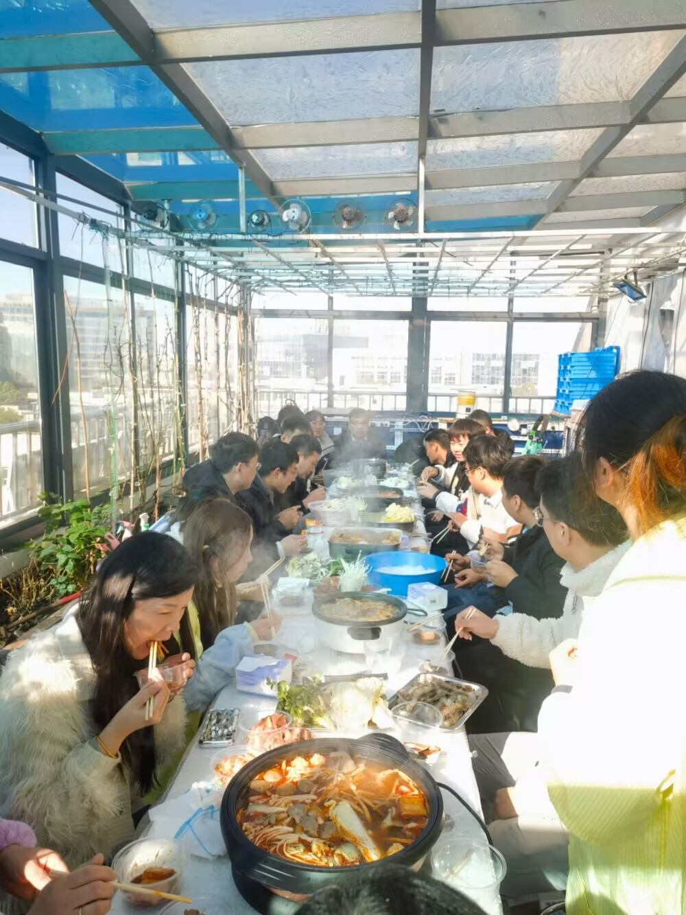 熱鬧的聚餐現(xiàn)場,公司的陽臺被精心打掃一番,營造了熱鬧的氛圍。聚餐桌上擺滿了各式食材,鮮美的肉片和新鮮的蔬菜,散發(fā)出誘人的香味。員工們歡聲笑語,將熱氣騰騰的火鍋料理得熱氛高漲,充滿著團(tuán)聚的喜悅和溫馨的氣氛。大家互相推杯換盞,共同慶祝著冬至佳節(jié),展現(xiàn)出一派歡樂祥和的景象。