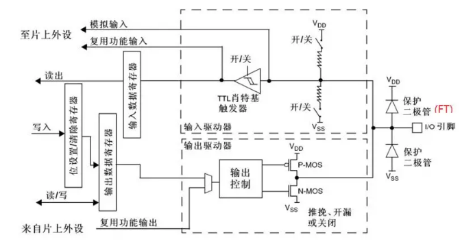 每個GPIO內(nèi)部都有這樣的一個電路結構,這個結構在本文下面會具體介紹。