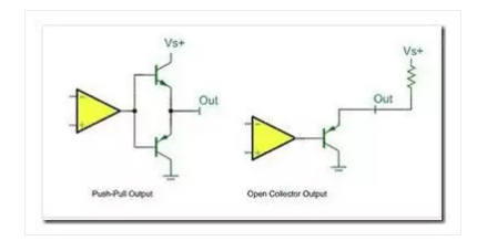 該圖中左邊的便是推挽輸出模式,其中比較器輸出高電平時下面的PNP三極管截止,而上面NPN三極管導通,輸出電平VS+;當比較器輸出低電平時則恰恰相反,PNP三極管導通,輸出和地相連,為低電平。右邊的則可以理解為開漏輸出形式,需要接上拉。