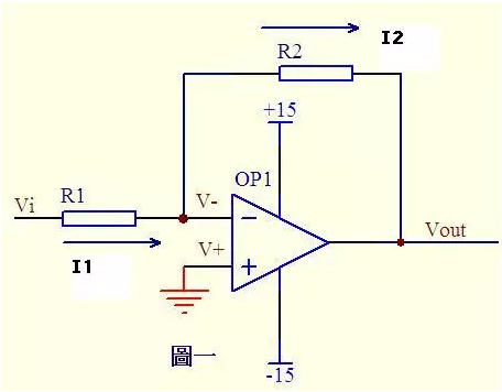 圖一運(yùn)放的同向端接地=0V,反向端和同向端虛短,所以也是0V,反向輸入端輸入電阻很高,虛斷,幾乎沒(méi)有電流注入和流出,那么R1和R2相當(dāng)于是串聯(lián) 的,流過(guò)一個(gè)串聯(lián)電路中的每一只組件的電流是相同的,即流過(guò)R1的電流和流過(guò)R2的電流是相同的。流過(guò)R1的電流I1 = (Vi - V-)/R1 ……a 流過(guò)R2的電流I2 = (V- - Vout)/R2 ……b V- = V+ = 0 ……c I1 = I2 ……d 求解上面的初中代數(shù)方程得Vout = (-R2/R1)*Vi 這就是傳說(shuō)中的反向放大器的輸入輸出關(guān)系式了。