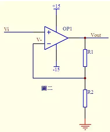 圖二中Vi與V-虛短,則 Vi = V- ……a 因?yàn)樘摂?,反向輸入端沒(méi)有電流輸入輸出,通過(guò)R1和R2 的電流相等,設(shè)此電流為I,由歐姆定律得:I = Vout/(R1+R2) ……b Vi等于R2上的分壓, 即:Vi = I*R2 ……c 由abc式得Vout=Vi*(R1+R2)/R2 這就是傳說(shuō)中的同向放大器的公式了。