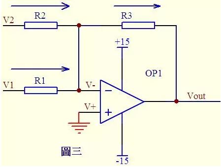 (編輯者注)質(zhì)疑:(V1 – V-)/R1 + (V2 – V-)/R2 = (V- – Vout)/R3 ……b 圖三公式中少了個(gè)負(fù)號(hào)?