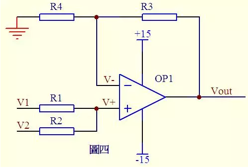 請(qǐng)看圖四。因?yàn)樘摂?,運(yùn)放同向端沒(méi)有電流流過(guò),則流過(guò)R1和R2的電流相等,同理流過(guò)R4和R3的電流也相等。故 (V1 – V+)/R1 = (V+ - V2)/R2 ……a (Vout – V-)/R3 = V-/R4 ……b 由虛短知:V+ = V- ……c 如果R1=R2,R3=R4,則由以上式子可以推導(dǎo)出 V+ = (V1 + V2)/2 V- = Vout/2 故 Vout = V1 + V2 也是一個(gè)加法器,呵呵!