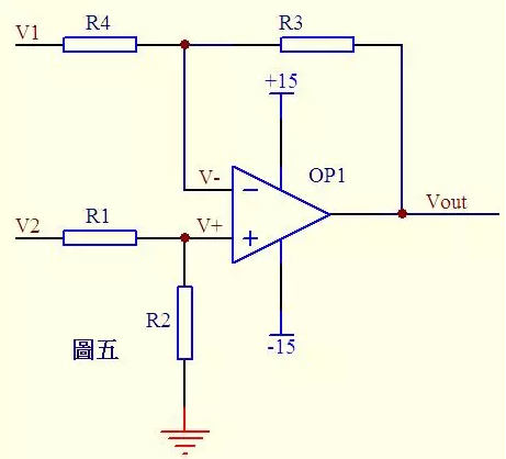 圖五由虛斷知,通過(guò)R1的電流等于通過(guò)R2的電流,同理通過(guò)R4的電流等于R3的電流,故有 (V2 – V+)/R1 = V+/R2 ……a (V1 – V-)/R4 = (V- - Vout)/R3 ……b 如果R1=R2, 則V+ = V2/2 ……c 如果R3=R4, 則V- = (Vout + V1)/2 ……d 由虛短知 V+ = V- ……e 所以 Vout=V2-V1 這就是傳說(shuō)中的減法器了。