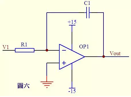 圖六電路中,由虛短知,反向輸入端的電壓與同向端相等,由虛斷知,通過(guò)R1的電流與通過(guò)C1的電流相等。通過(guò)R1的電流 i=V1/R1 通過(guò)C1的電流i=C*dUc/dt=-C*dVout/dt 所以 Vout=((-1/(R1*C1))∫V1dt 輸出電壓與輸入電壓對(duì)時(shí)間的積分成正比,這就是傳說(shuō)中的積分電路了。若V1為恒定電壓U,則上式變換為Vout = -U*t/(R1*C1) t 是時(shí)間,則Vout輸出電壓是一條從0至負(fù)電源電壓按時(shí)間變化的直線。