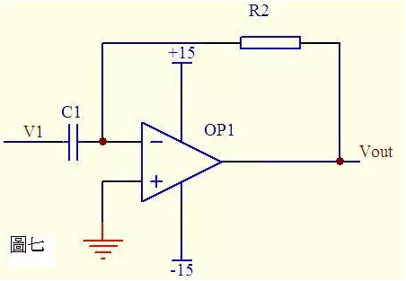 圖七中由虛斷知,通過(guò)電容C1和電阻R2的電流是相等的,由虛短知,運(yùn)放同向端與反向端電壓是相等的。則:Vout = -i * R2 = -(R2*C1)dV1/dt 這是一個(gè)微分電路。如果V1是一個(gè)突然加入的直流電壓,則輸出Vout對(duì)應(yīng)一個(gè)方向與V1相反的脈沖。