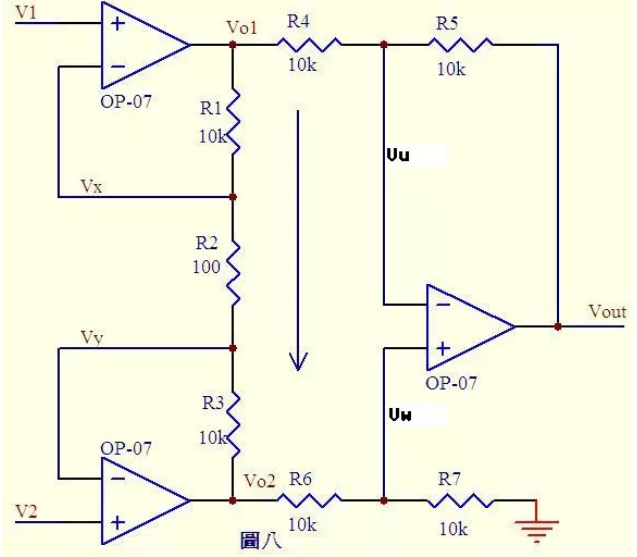 圖八.由虛短知 Vx = V1 ……a Vy = V2 ……b 由虛斷知,運(yùn)放輸入端沒(méi)有電流流過(guò),則R1、R2、R3可視為串聯(lián),通過(guò)每一個(gè)電阻的電流是相同的, 電流I=(Vx-Vy)/R2 ……c 則:Vo1-Vo2=I*(R1+R2+R3) = (Vx-Vy)(R1+R2+R3)/R2 ……d 由虛斷知,流過(guò)R6與流過(guò)R7的電流相等,若R6=R7, 則Vw = Vo2/2 ……e 同理若R4=R5,則Vout – Vu = Vu – Vo1,故Vu = (Vout+Vo1)/2 ……f 由虛短知,Vu = Vw ……g 由efg得 Vout = Vo2 – Vo1 ……h(huán) 由dh得 Vout = (Vy –Vx)(R1+R2+R3)/R2 上式中(R1+R2+R3)/R2是定值,此值確定了差值(Vy –Vx)的放大倍數(shù)。這個(gè)電路就是傳說(shuō)中的差分放大電路了。