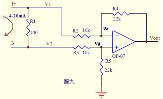 分析一個(gè)大家接觸得較多的電路。很多控制器接受來(lái)自各種檢測(cè)儀表的0~20mA或4~20mA電流,電路將此電流轉(zhuǎn)換成電壓后再送ADC轉(zhuǎn)換成數(shù)字信號(hào),圖九就是這樣一個(gè)典型電路。如圖4~20mA電流流過(guò)采樣100Ω電阻R1,在R1上會(huì)產(chǎn)生0.4~2V的電壓差。由虛斷知,運(yùn)放輸入端沒(méi)有電流流過(guò),則流過(guò)R3和R5的電流相等,流過(guò)R2和R4的電流相等。故:(V2-Vy)/R3 = Vy/R5 ……a (V1-Vx)/R2 = (Vx-Vout)/R4 ……b 由虛短知:Vx = Vy ……c 電流從0~20mA變化,則V1 = V2 + (0.4~2) ……d 由cd式代入b式得(V2 + (0.4~2)-Vy)/R2 = (Vy-Vout)/R4 ……e 如果R3=R2,R4=R5,則由e-a得Vout = -(0.4~2)R4/R2 ……f 圖九中R4/R2=22k/10k=2.2,則f式Vout = -(0.88~4.4)V,即是說(shuō),將4~20mA電流轉(zhuǎn)換成了-0.88 ~ -4.4V電壓,此電壓可以送ADC去處理。