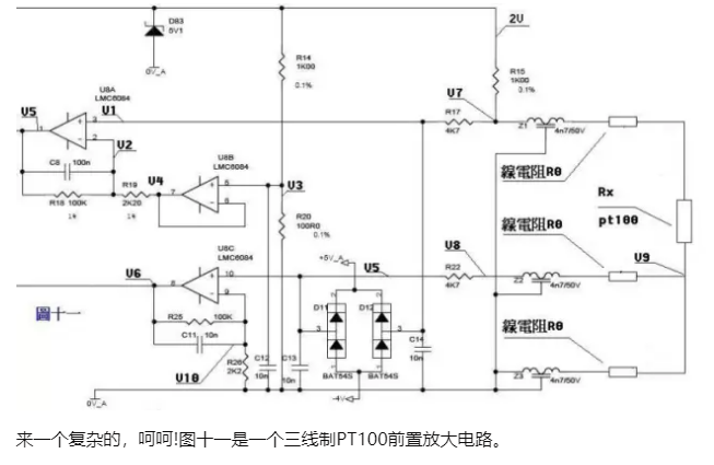 PT100傳感器引出三根材質(zhì)、線徑、長(zhǎng)度完全相同的線,接法如圖所示。有2V的電壓加在由R14、R20、R15、Z1、PT100及其線電阻組成的橋電路上。Z1、Z2、Z3、D11、D12、D83及各電容在電路中起濾波和保護(hù)作用,靜態(tài)分析時(shí)可不予理會(huì),Z1、Z2、Z3可視為短路,D11、D12、D83及各電容可視為開(kāi)路。由電阻分壓知, V3=2*R20/(R14+20)=200/1100=2/11 ……a 由虛短知,U8B第6、7腳 電壓和第5腳電壓相等 V4=V3 ……b 由虛斷知,U8A第2腳沒(méi)有電流流過(guò),則流過(guò)R18和R19上的電流相等。(V2-V4)/R19=(V5-V2)/R18 ……c 由虛斷知,U8A第3腳沒(méi)有電流流過(guò), V1=V7 ……d 在橋電路中R15和Z1、PT100及線電阻串聯(lián),PT100與線電阻串聯(lián)分得的電壓通過(guò)電阻R17加至U8A的第3腳, V7=2*(Rx+2R0)/(R15+Rx+2R0) …..e 由虛短知,U8A第3腳和第2腳電壓相等,V1=V2 ……f 由abcdef得, (V5-V7)/100=(V7-V3)/2.2 化簡(jiǎn)得 V5=(102.2*V7-100V3)/2.2 即 V5=204.4(Rx+2R0)/(1000+Rx+2R0) – 200/11 ……g 上式輸出電壓V5是Rx的函數(shù)我們?cè)倏淳€電阻的影響。Pt100最下端線電阻上產(chǎn)生的電壓降經(jīng)過(guò)中間的線電阻、Z2、R22,加至U8C的第10腳,由虛斷知, V5=V8=V9=2*R0/(R15+Rx+2R0) ……a (V6-V10)/R25=V10/R26 ……b 由虛短知, V10=V5 ……c 由式abc得 V6=(102.2/2.2)V5=204.4R0/[2.2(1000+Rx+2R0)] ……h(huán) 由式gh組成的方程組知,如果測(cè)出V5、V6的值,就可算出Rx及R0,知道Rx,查pt100分度表就知道溫度的大小了。