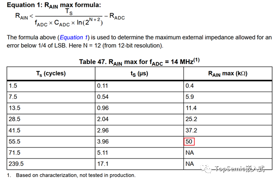 Tab 46標稱的最大輸入阻抗50kΩ,是在ADC時鐘頻率14Mhz,采樣周期55.5 cycles,轉(zhuǎn)換位數(shù)12時計算出來的值,它同時也是ADC模塊所能接受的最大值 (受硬件決定,這也是為什么Tab 47最后兩行寫NA的原因,雖然根據(jù)公式也能算出來一個比50更大的值)。