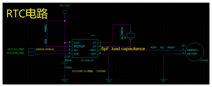 如上圖所示,此芯片為DS1339U-33+,3.3V供電,pin1和pin2腳接32.768KHZ的晶體,pin8腳接3.3V電源,pin3腳電池供電,這顆芯片的電源供電和電池供電不需要二極管,內(nèi)部有切換電路,當(dāng)3.3V電源斷電后自動(dòng)無(wú)縫切換到電池供電,控制方式I2C如上圖pin6和pin5腳,此接口并接在I2C總線上,芯片地址:1101000,查閱芯片資料有介紹芯片的地址,所用晶體規(guī)格有明確說(shuō)明32.768KHZ的晶體需要6pf負(fù)載電容,常規(guī)的32.768KHZ晶體都是12.5pF。