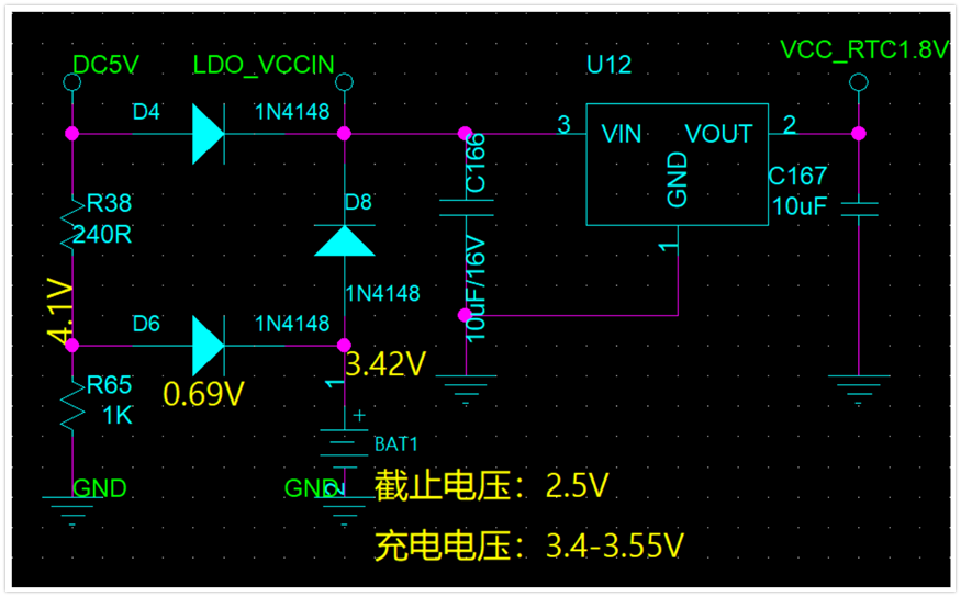 用5.2V的原因是,源電路已經(jīng)將電壓調(diào)高到5.2V。充電電壓滿足后,就能正常充電。5.2V同時(shí)給U12轉(zhuǎn)換一個(gè)1.8V給RTC供電,也就是在主電源沒(méi)斷電的狀態(tài)下,LDO_VCCIN的電壓電壓高于D8輸出的電壓,此時(shí)D8是截止的,放不出電,但是主電源沒(méi)電的狀態(tài)下,充電電池就從D8輸出給U12,達(dá)到送到RTC供電的目的,原理已經(jīng)講明白了,下面說(shuō)一下知識(shí)點(diǎn)。