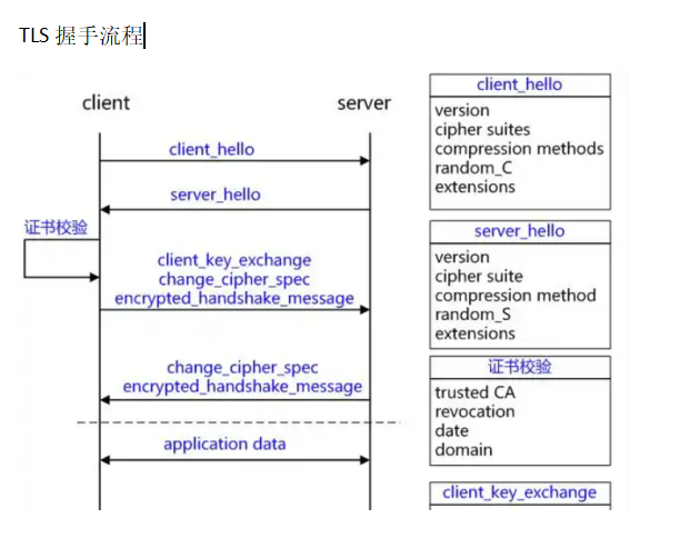 建立連接后先由客戶端發(fā)送Client Hello信息,包含TLS協(xié)議版本信息、會(huì)話ID、支持的加密套件、用于計(jì)算秘鑰的隨機(jī)數(shù)等。服務(wù)器在能夠找到一組可接受的算法后,將響應(yīng)Client Hello消息并發(fā)送server hello,包括服務(wù)器版本、選擇的加密算法、密鑰交換算法、用于計(jì)算秘鑰的隨機(jī)數(shù)、MAC算法、根據(jù)客戶端會(huì)話參數(shù)生成的會(huì)話ID(用于會(huì)話恢復(fù))等。再協(xié)商好加密算法后服務(wù)器、客戶端驗(yàn)證證書,交換密鑰,建立連接。
