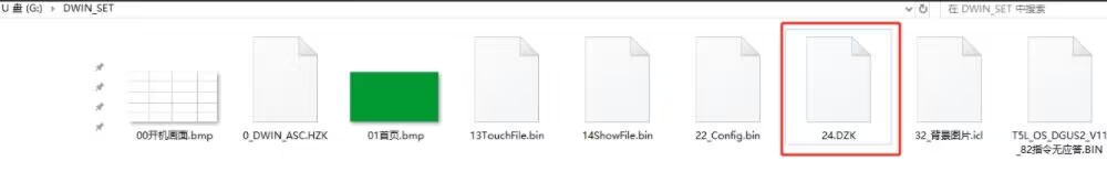 (2)把bin文件放到迪文屏燒錄的文件里, 命名方式采用數(shù)字16-31的數(shù)字開頭,然后就是把.bin改成.DZK,采用此方法的目的,就是把需要更新的單片機(jī)bin程序偽裝成字庫文件,誘騙迪文屏認(rèn)為此文件就是字庫文件,下載迪文屏程序的時候,迪文屏?xí)`認(rèn)為此文件就是字庫文件,就會一起存儲到迪文屏的flash里面。