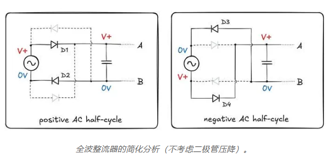 在正半周期,二極管 D1 和 D2 最初是正向偏置的;這允許電容器充電到交流峰值電壓(減去兩個二極管的壓降總和)。在負半周期,二極管 D3 和 D4 變?yōu)檎蚱?,這將輸出 B 連接到上部電源端子。同時,當前處于更高電壓的底部電源端子連接到 A 點。這允許電容器繼續(xù)以與之前相同的極性充電。