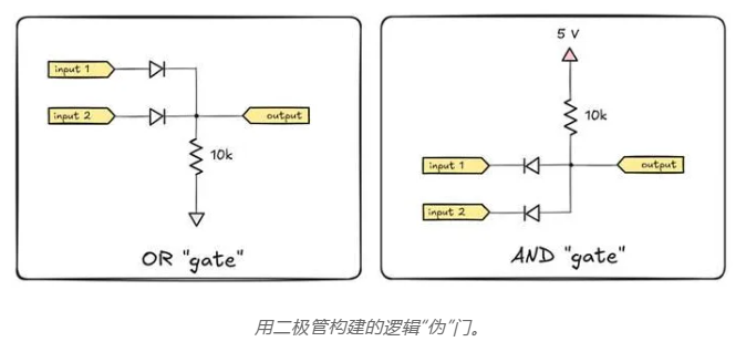 在或門電路(左)的情況下,如果正電源軌連接到任何輸入端子,這將使相應的二極管正向偏置,并導致電流流過電阻。因為正向偏置二極管的阻抗遠低于 10 kΩ 電阻的阻抗,所以輸出電壓會飆升到非常接近上電源軌。